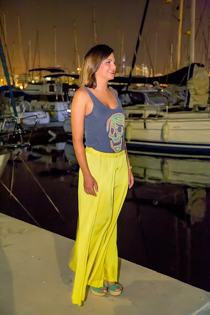 Hoy os traigo un outfit que elegí para salir en mis últimas vacaciones, compuesto por maxi falda amarilla, camiseta con calavera multicolor y cuñas en verde agua, como complemento solo mi reloj de Sekonda en dorado y azul, ya que era un look lleno de color al que creo que no le hacía falta nada más.